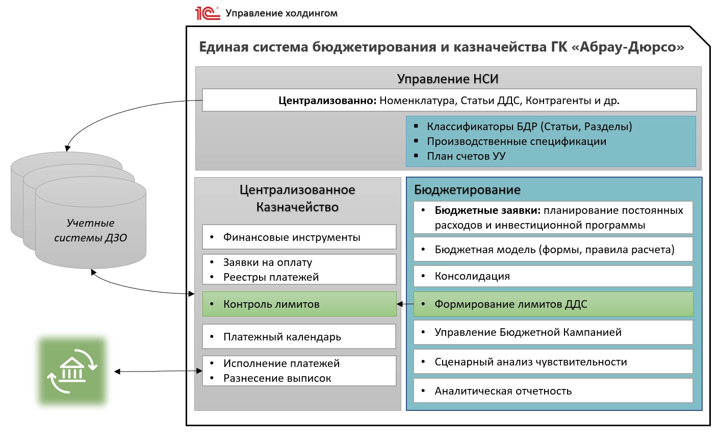 - интеграция процессов бюджетирования с централизованным казначейством в части формирования лимитов ДДС;
