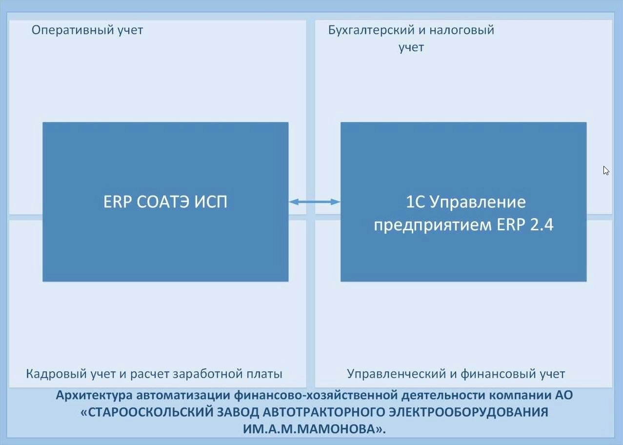 Чтобы полноценно вести оперативный и производственный учет, формировать заказы клиентам, заказы на производство и т.д., СОАТЭ разработали собственную систему оперативного учета. Чтобы вести регламентированный учет и сдавать отчетность программисты СОАТЭ настроили выгрузку из собственной системы оперативного учета в систему стороннего вендора.