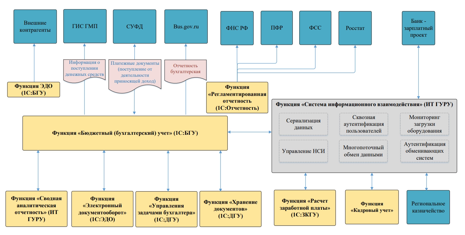 - планово-финансовое управление — «1С:Планово-финансовое управление для государственных учреждений»; информационное взаимодействие — Dataguru;