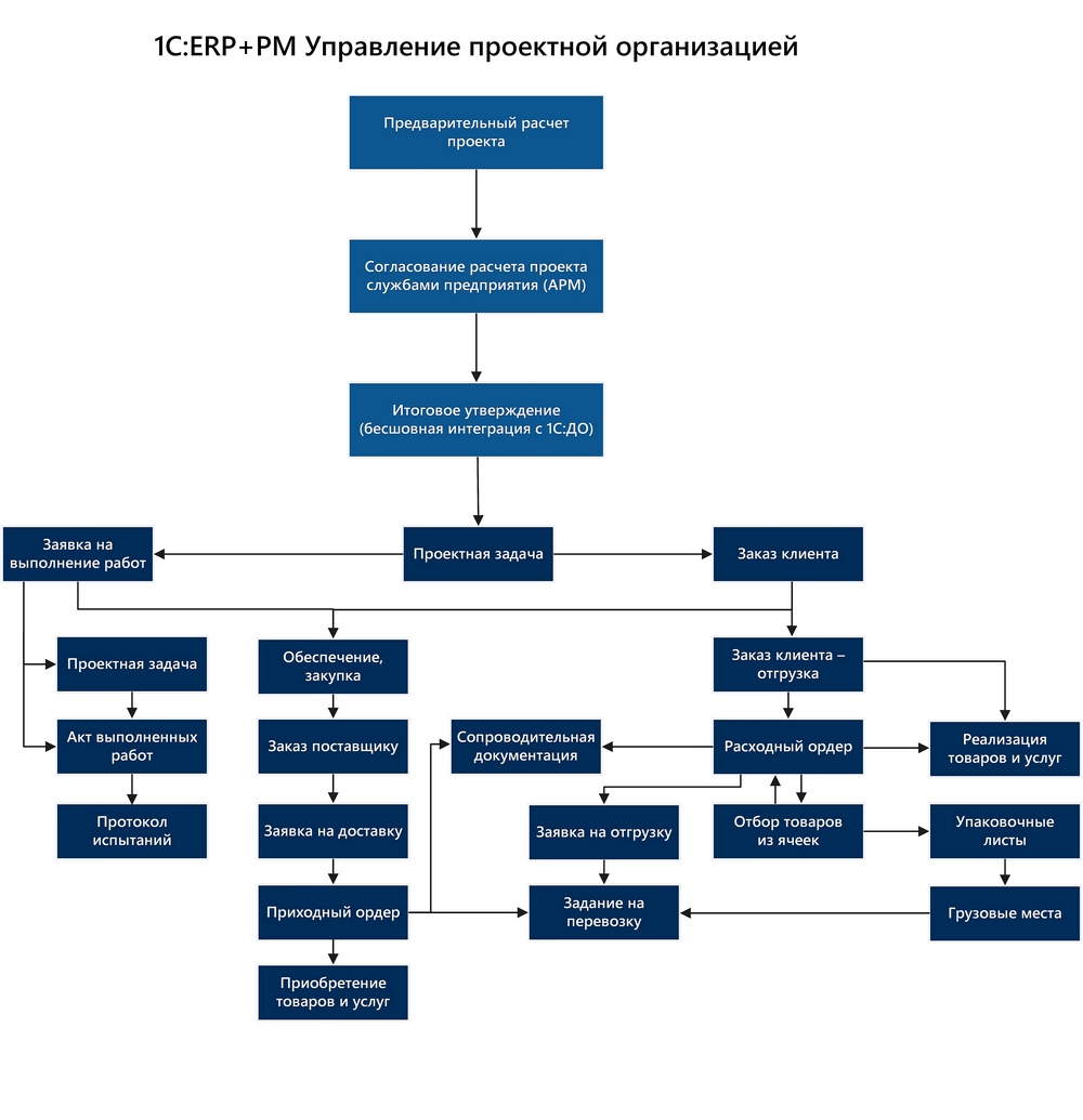 Система автоматизации проектной деятельности построена на базе «1С:ERP+PM Управление предприятием 2» выступает в качестве единой системы управления компанией. Для оперативного согласования используется система «1С:Документооборот», интегрированная с «1С:ERP+PM 2». Для оперативной сдачи регламентированной отчетности реализована интеграция между «1С:Бухгалтерия» и «1С:ERP+PM 2» с помощью разработанного АРМ «Обмен».