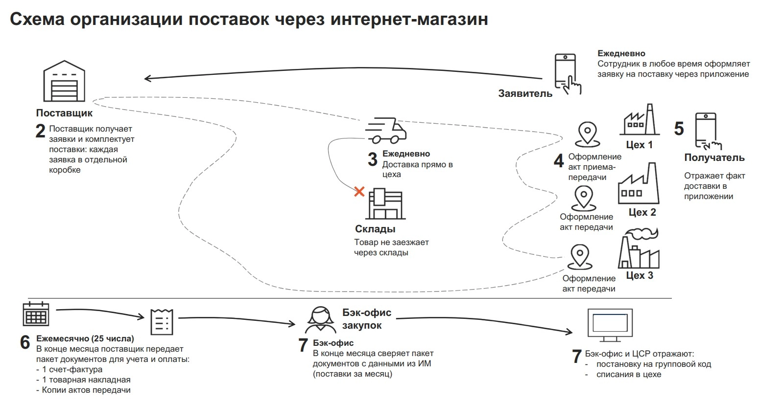 ООО «ЕвразХолдинг» управляет производственными металлургическими и горнодобывающими предприятиями в Сибири и на Урале. Производственный персонал в ходе своей работы использует различные ТМЦ. Для получения ТМЦ, производственный персонал оформлял заявку на поставку по сложным, зарегламентированным процедурам. Процесс поставки ТМЦ был не прозрачным для заказчика, зрок поставки достигал 90 дней. В процессе было задействовано большое количество специалистов службы снабжения.