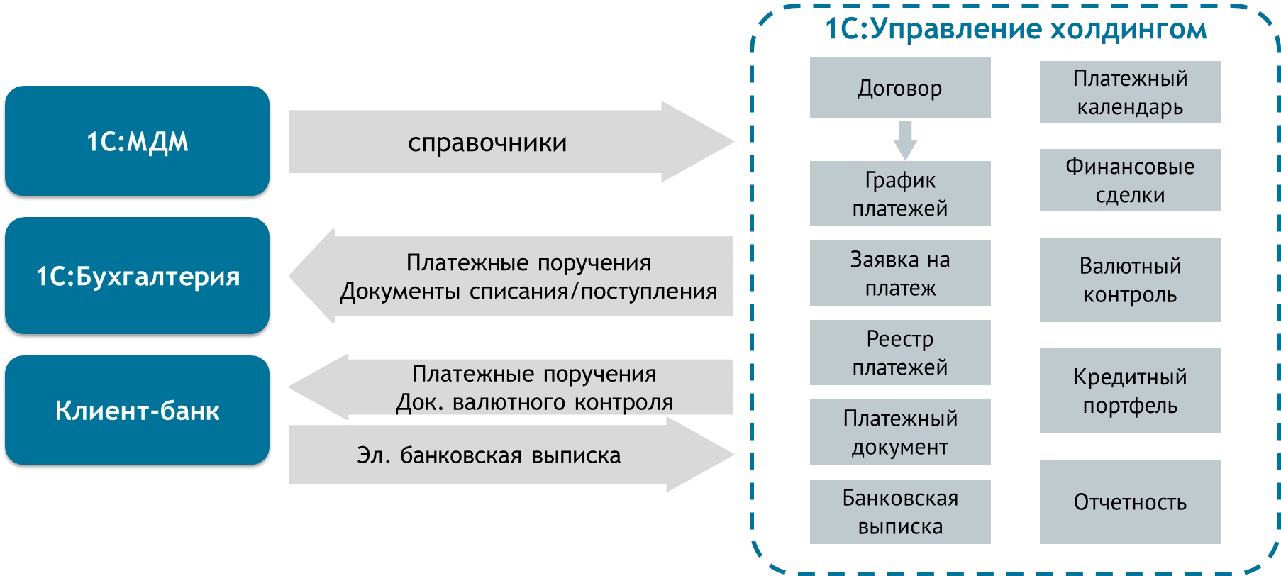 - Комплексная автоматизация функций казначейства всех ДО холдинга на базе программного продукта «1С:Управление холдингом».