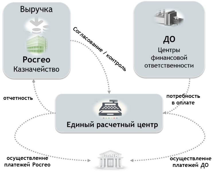 Особенностью деятельности холдинга является исполнение государственных проектов, предусматривающих казначейское сопровождение госконтрактов и договоров, заключенных в рамках их исполнения, и расчеты по лицевым счетам, открытым в территориальных подразделениях Управления Федерального Казначейства. Функционал системы на базе «1С:Управление холдингом» позволил организовать возможность проведения и контроля платежей в привязке к госконтракту по всей цепочке исполнения проекта. В связи с тем, что ДО территориально распределены по всей территории России, было принято решение сделать распределение сотрудников единого расчетного центра по опорным точкам для охвата всех часовых поясов, в которых работают предприятия холдинга. Без автоматизации платежных процессов в единой информационной системе с возможностью внедрения ролевой модели, проект создания ЕРЦ не был бы реализован. Проект автоматизации был внедрен в сжатые сроки — весь цикл работ реализован в течение 10 месяцев, включая как этапы внедрения, так и тиражирования на ДО.