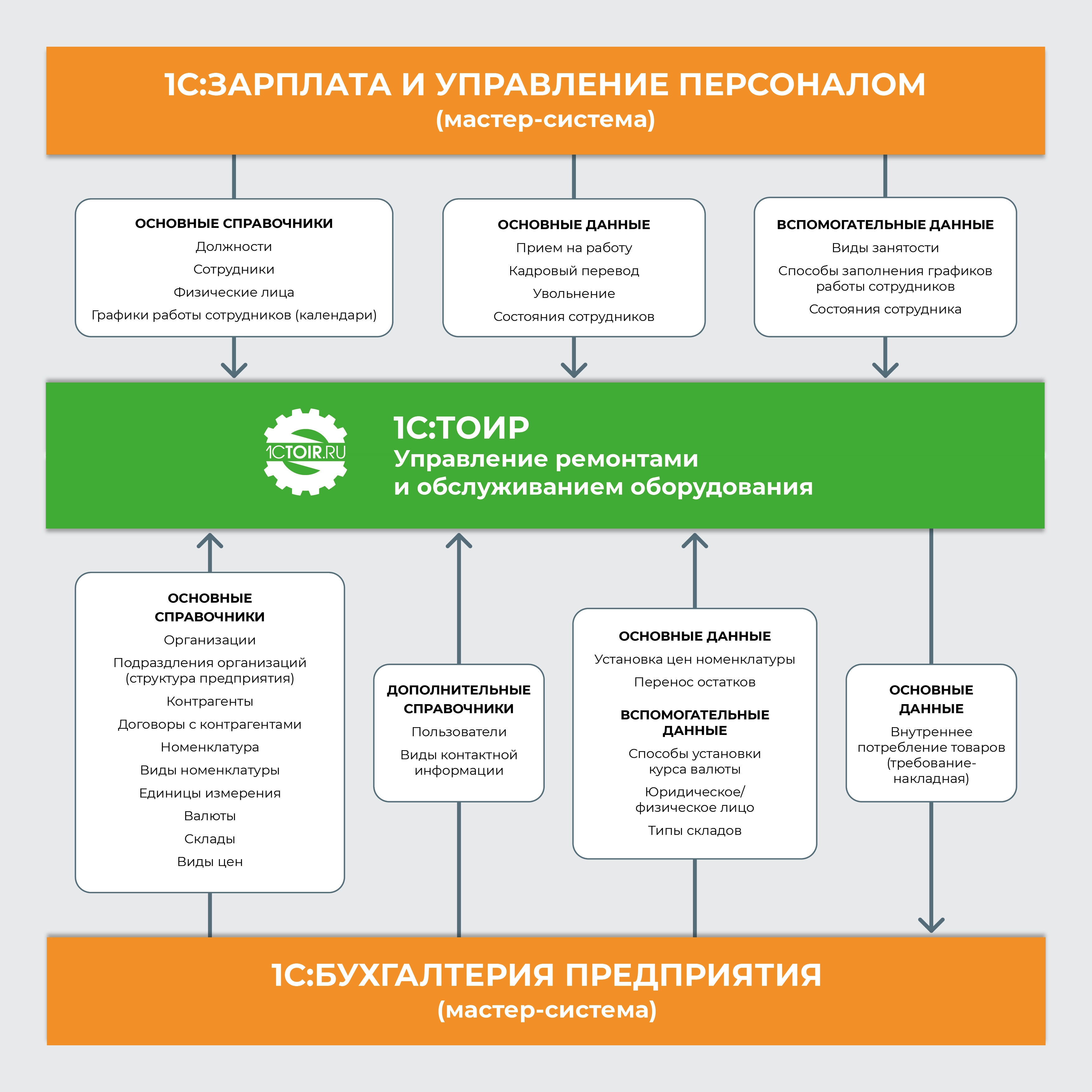 Из 1С:ЗУП в 1С:ТОИР 2 КОРП поступают данные о сотрудниках (должности, контактная информация, информация о приеме на работу, кадровых переводах и увольнении), а также их графики работы.