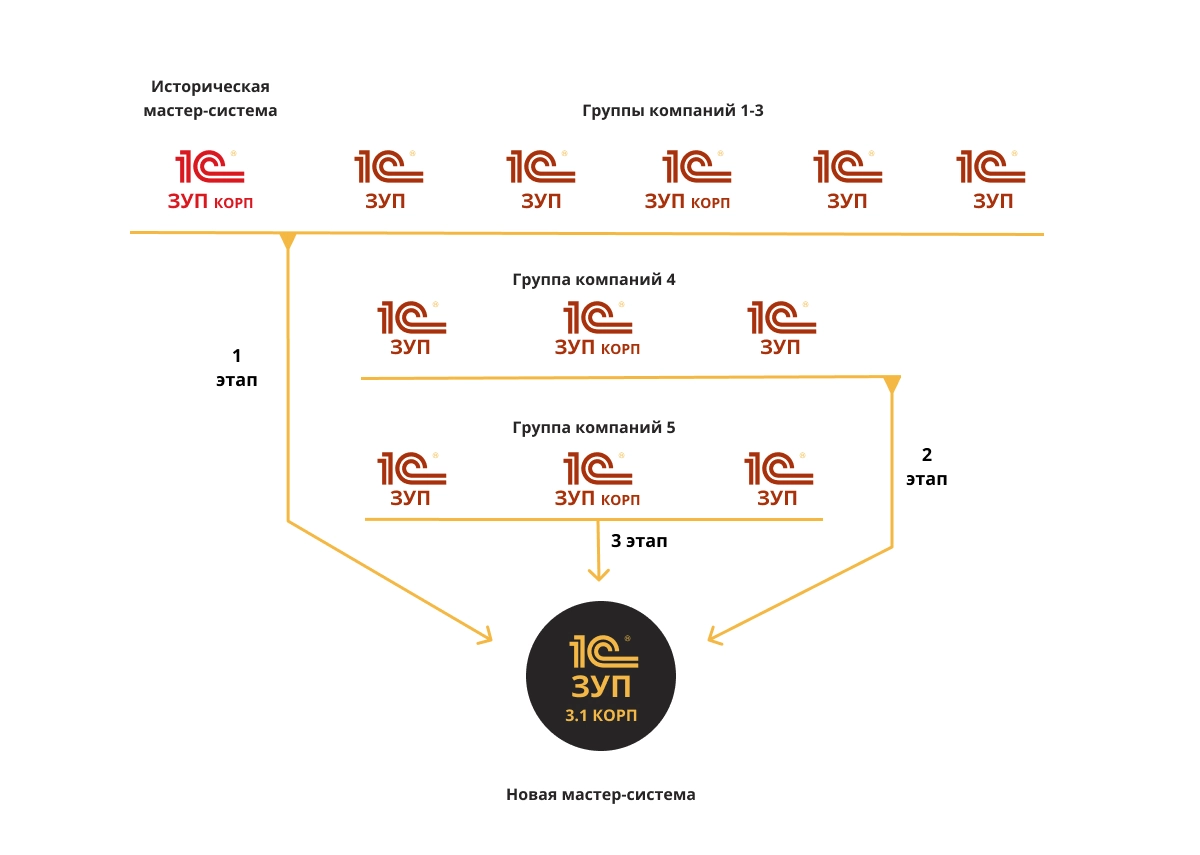 - в компаниях холдинга использовалась разветвленная организационная структура. Учет по кадровому делопроизводству ввелся в 12 разных базах 1С:ЗУП 3.1 версий КОРП и ПРОФ с разным уровнем кастомизации.