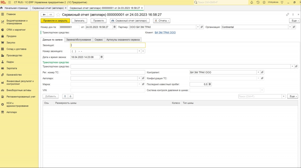 - выбрать, какие шины будут установлены, серийные номера, оказанные услуги, дополнительные артикулы сервиса.