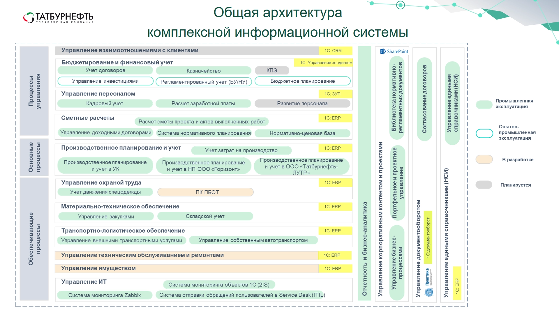 Компания «Татбурнефть» построила комплексную цифровую систему управления на базе платформы «1С:Предприятие». Система состоит из интегрированных функциональных модулей, поддерживающих ключевые бизнес-процессы и позволяющих передавать информацию всем участникам процессов на всех уровнях управления. В рамках системы консолидированы все бизнес-процессы как основного производства (строительства скважин), с которыми работают все производственные службы (буровики, монтажники, геологи, технологи), так и процессы обеспечения.