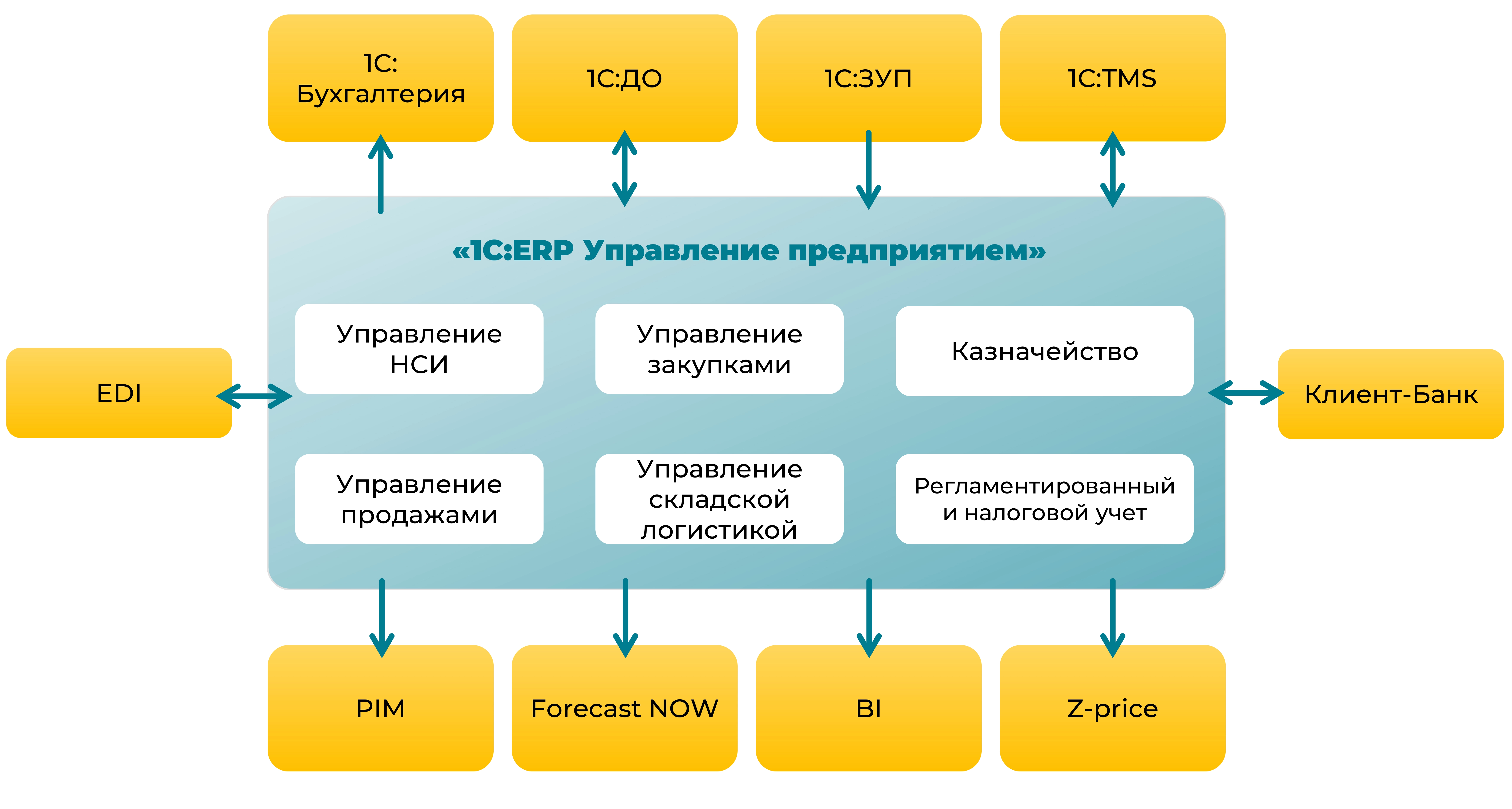 - интеграции: «1С:Бухгалтерия», «1С:ТМС», «1С:ЗУП», «1С:ДО», ЭДО.