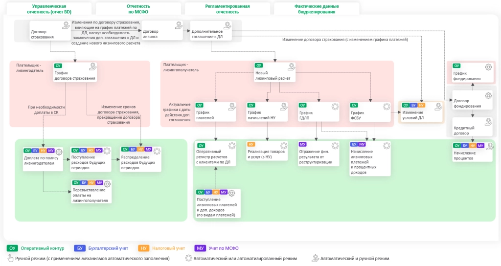 1С АСУЛД обеспечивает связность и прослеживаемость плановых и фактических данных как при заключении договора лизинга, так и в последующих регламентных операциях по нему.