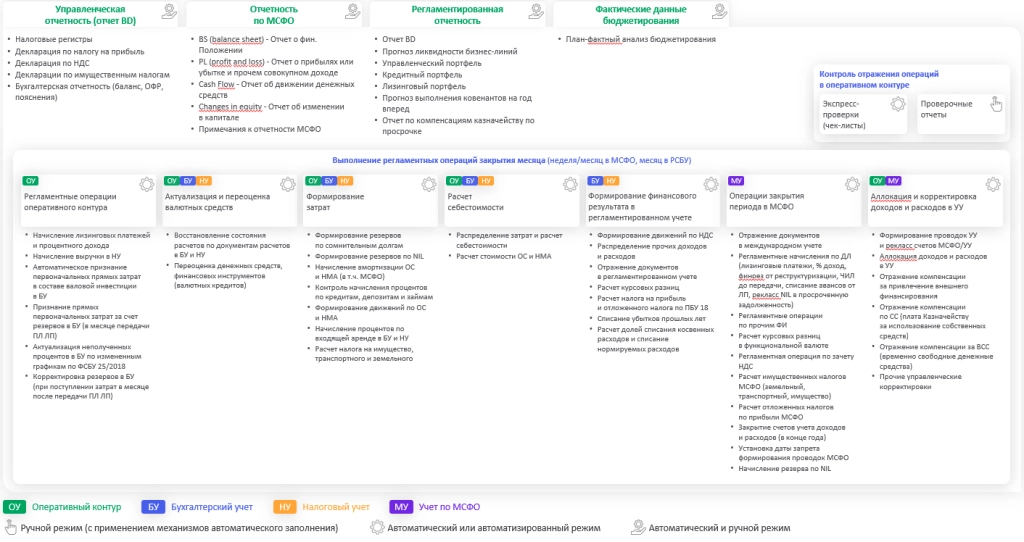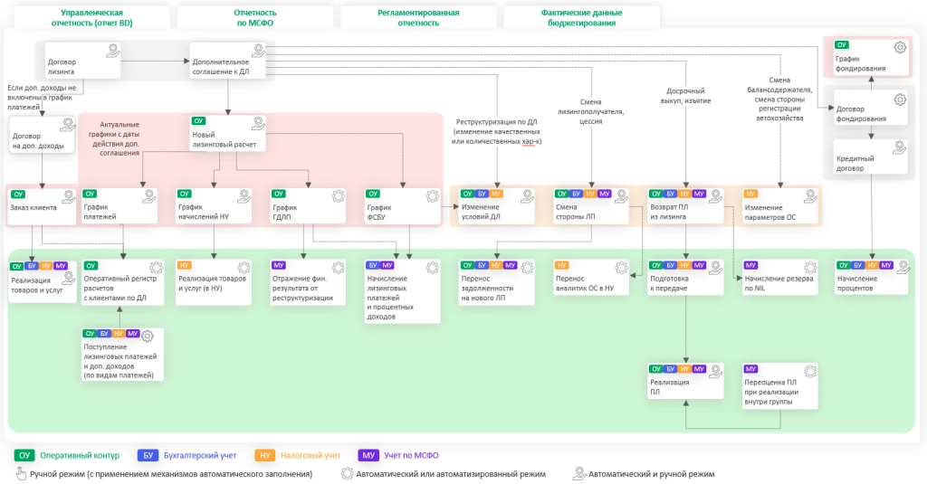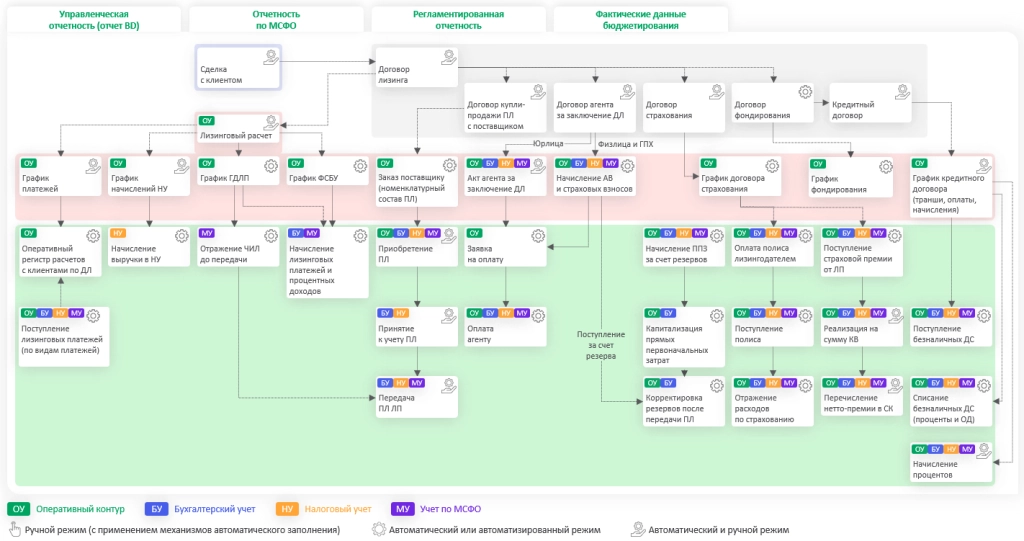 Внедренная система управления лизинговой деятельностью (1С АСУЛД) позволяет отражать основные операции оперативного контура (от заключения договора лизинга и передачи предмета лизинга лизингополучателю до выбытия предмета лизинга при прекращении действия договора), на основе которых формируются проводки регламентированного учета, международного учета по МСФО, а также фактические данные бюджетирования. В системе автоматизированы специфические области учета согласно новой методологии: