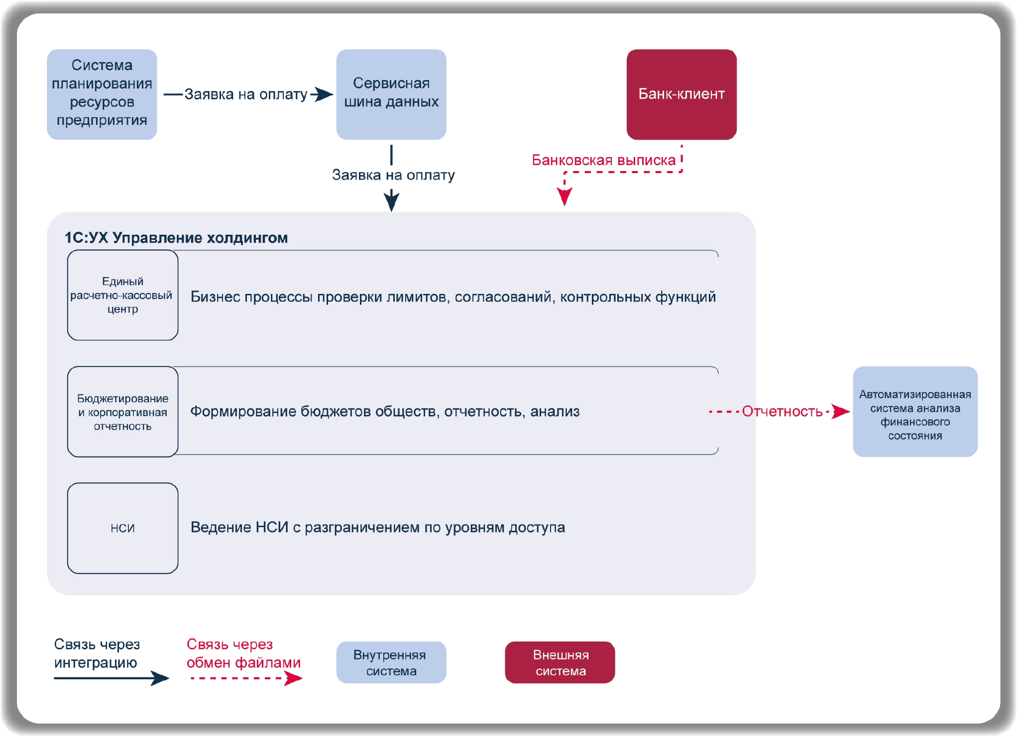 В программном продукте «1С:Управление холдингом» реализованы модули «Казначейство», «Бюджетирование и корпоративная отчетность» и модуль по управлению НСИ. Обеспечена интеграция заявок на оплату в «1С:Управление холдингом». Происходит выполнение всех функций казначейства в едином расчетно-кассовом центре. Формируется план-фактная отчетность с возможностью выгрузки для внешних пользователей.