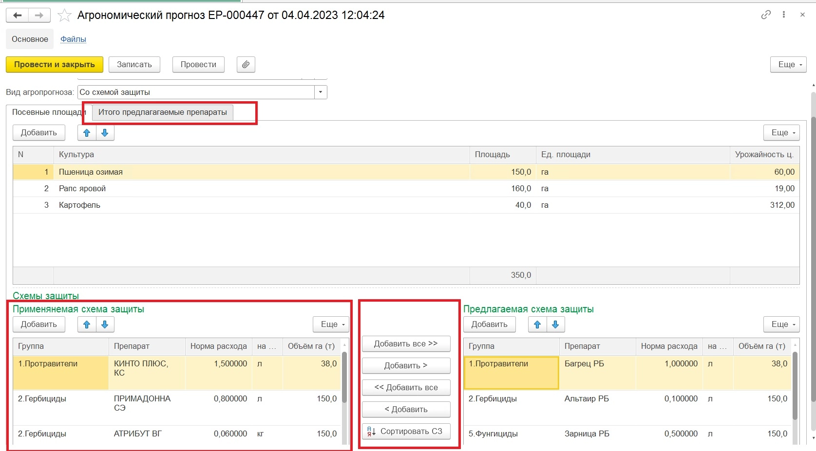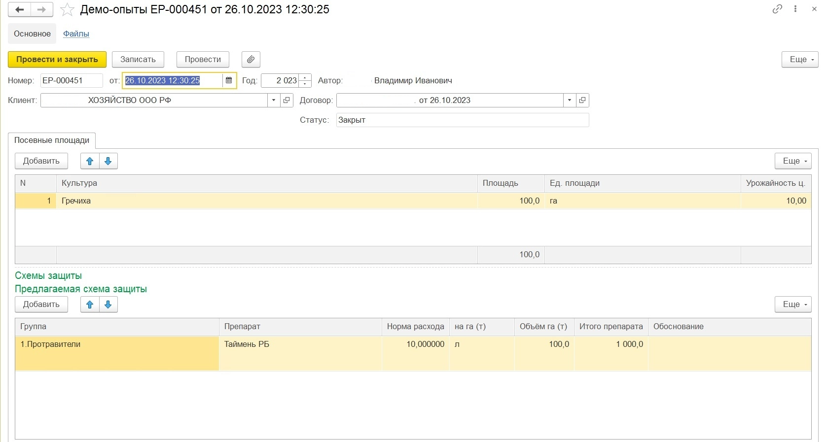 - создание документов «Демо-опыт» и «Агропрогноз», позволяющих учитывать препараты защиты растений, переданные заказчикам и отмечать результат использования препаратов + отчеты для контроля данного процесса;