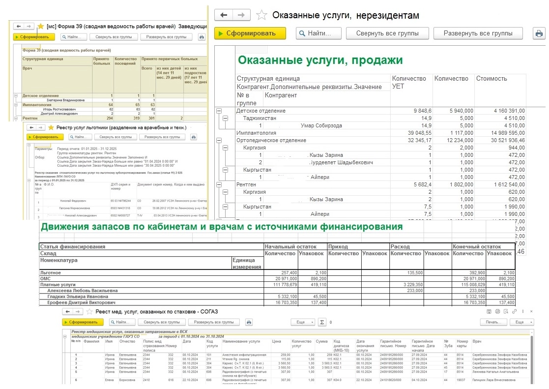 - Реализован уникальный механизм учета по статьям финансирования (ОМС, бюджет, платные услуги).
