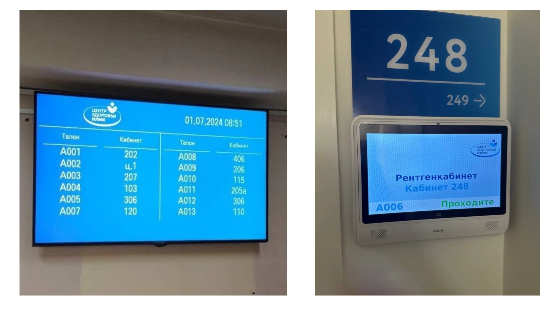 - Интерактивные информационные табло теперь в режиме реального времени отображают актуальную информацию о прохождении разных кабинетов, что значительно повысило прозрачность процесса и комфорт для пациентов.
