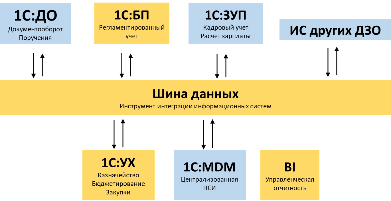 Обмен данными с другими учетными контурами реализован через 1С:Шину данных. Нормативно-справочная информация централизованно управляется через систему
