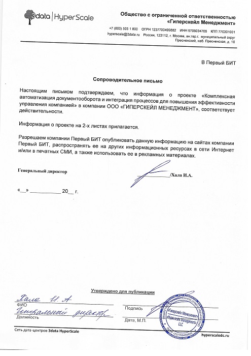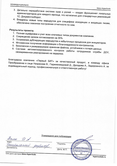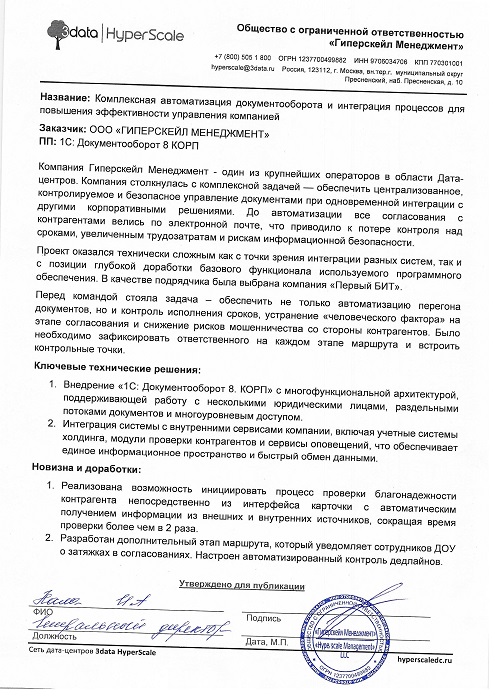 В компании «Гиперскейл Менеджмент» построили современную систему электронного документооборота, автоматизирующую учет входящих, исходящих и внутренних документов на базе решения «1С:Документообот». Реализованы функции оперативной проверки надежности контрагентов и детальный контроль всех этапов согласования. Благодаря этим доработкам компания существенно ускорила обработку документов, повысила прозрачность процессов и укрепила информационную безопасность.