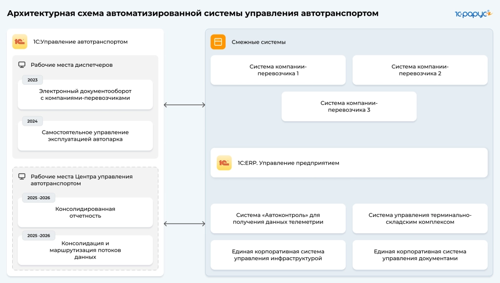 - 2025-2026 годы: запланировано усиление технической инфраструктуры и тиражирование системы на 16 железных дорог во всех субъектах страны. Планируется настроить: интеграции с «1C:ERP Управление предприятием» и смежными системами подразделений, которые также осуществляют перевозки в целях производственной деятельности; консолидацию данных и формирование сводных отчетов на всех уровнях управления автотранспортом.