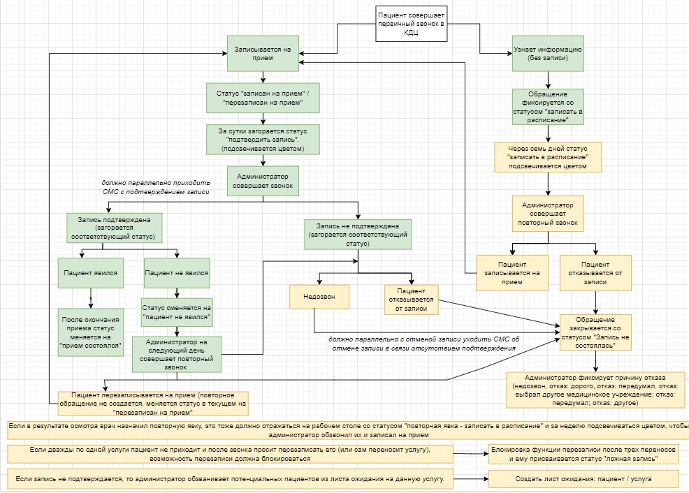 - Разработана CRM-подсистема для управления записью на прием, включая регистрацию новых пациентов и клиентов на платные услуги, с функциями напоминания о записи (за сутки и за полчаса до приема) и подтверждения визита. Система оптимизировала работу регистраторов, объединив; необходимые инструменты в едином удобном рабочем месте. Схема бизнес-процесса обслуживания платных пациентов приведена в дополнительных материалах к описанию проекта.