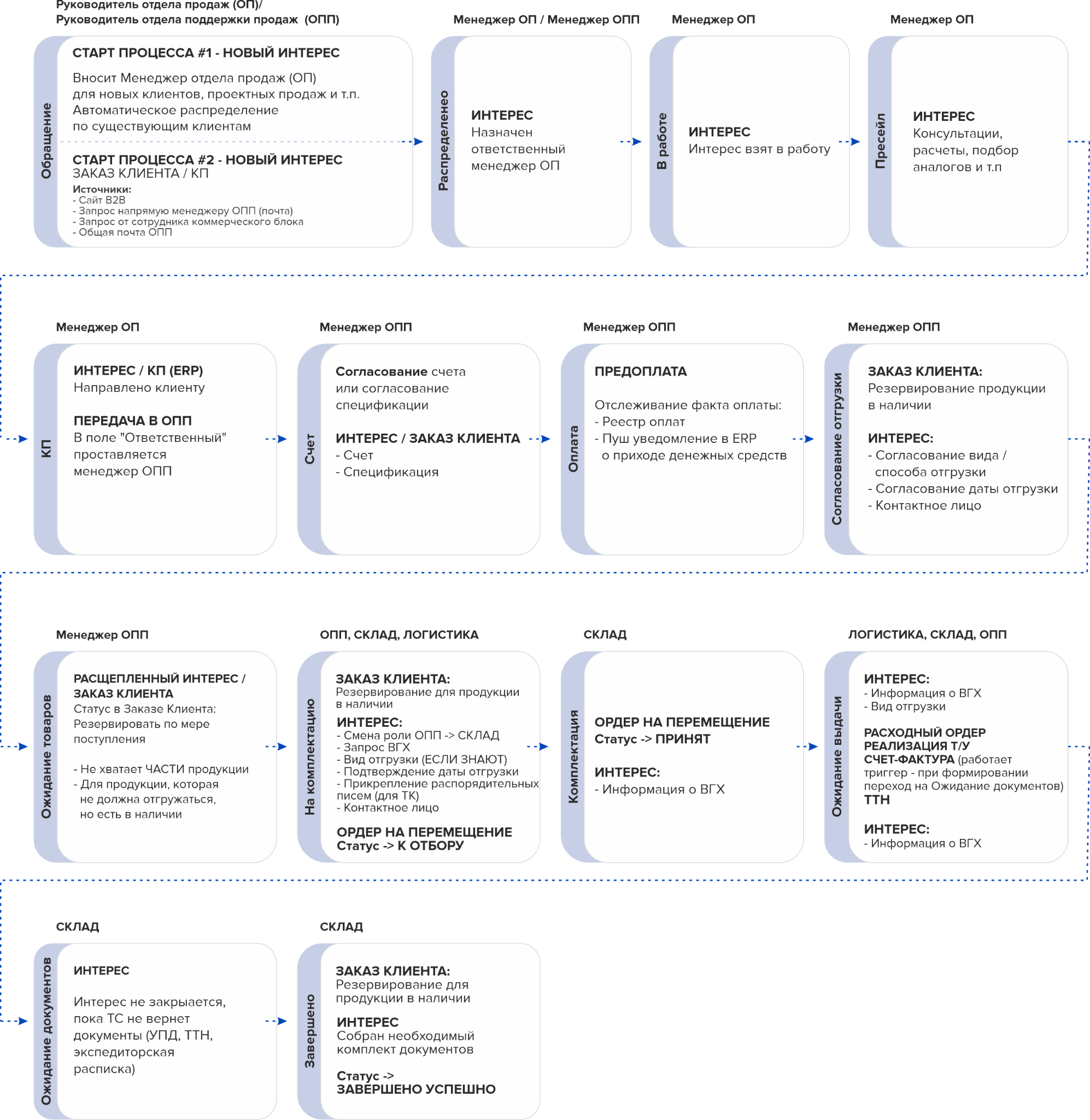 - Создана единая система работы с клиентами: от вхождения интереса в компанию до выдачи груза и возврата подписанных документов от клиента. По всей цепочке движения интересов построено сквозное взаимодействие отделов b2b-продаж, поддержки продаж, закупок и логистики, складского комплекса, отдела оформления документов.