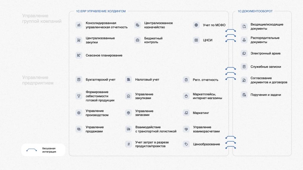 Такое положение дел создавало ряд существенных проблем. Во‑первых, наличие двух разнородных программных решений приводило к дублированию ввода данных и сложностям с их синхронизацией, что повышало затраты на поддержку и администрирование. Во‑вторых, функционал 1С:УПП не соответствовал растущим потребностям холдинга — платформе недоставало возможностей для комплексной автоматизации сложных бизнес‑процессов и интеграции всех ключевых направлений деятельности компании.