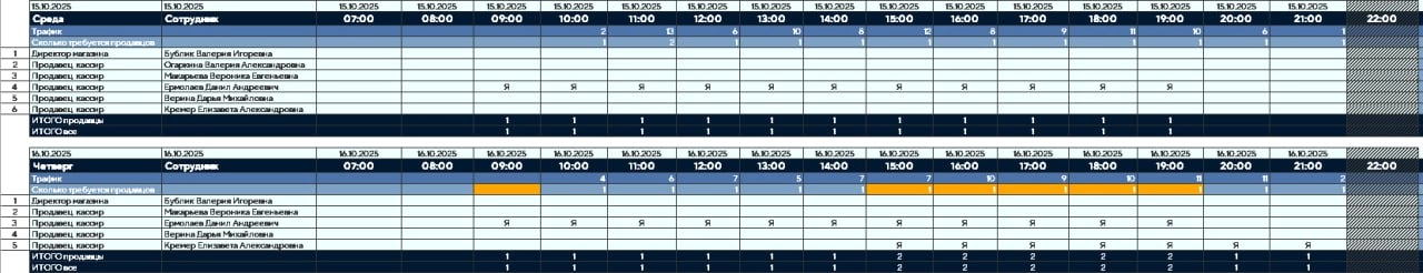 - Разработка визуальных подсказок и механизмов контроля. Подсвечивать недостающее или наоборот превышающее количество сотрудников в зале, потенциальную перегрузку продавцов или нехватку часов, предлагать варианты решения (например, вывод административного состава или привлечение аутсорса).
