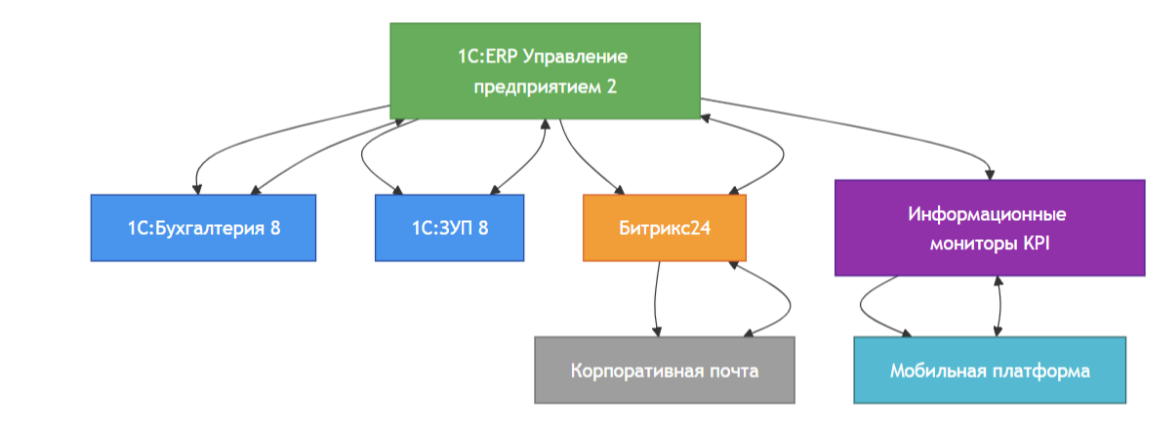 Центральная ERP-система интегрирована двусторонне с «1С:Бухгалтерией» и 1С:ЗУП, обеспечивая единое информационное пространство. Данные из Битрикс24 и корпоративной почты синхронизируются в режиме реального времени. Мониторы KPI и мобильный доступ дополняют функциональность.