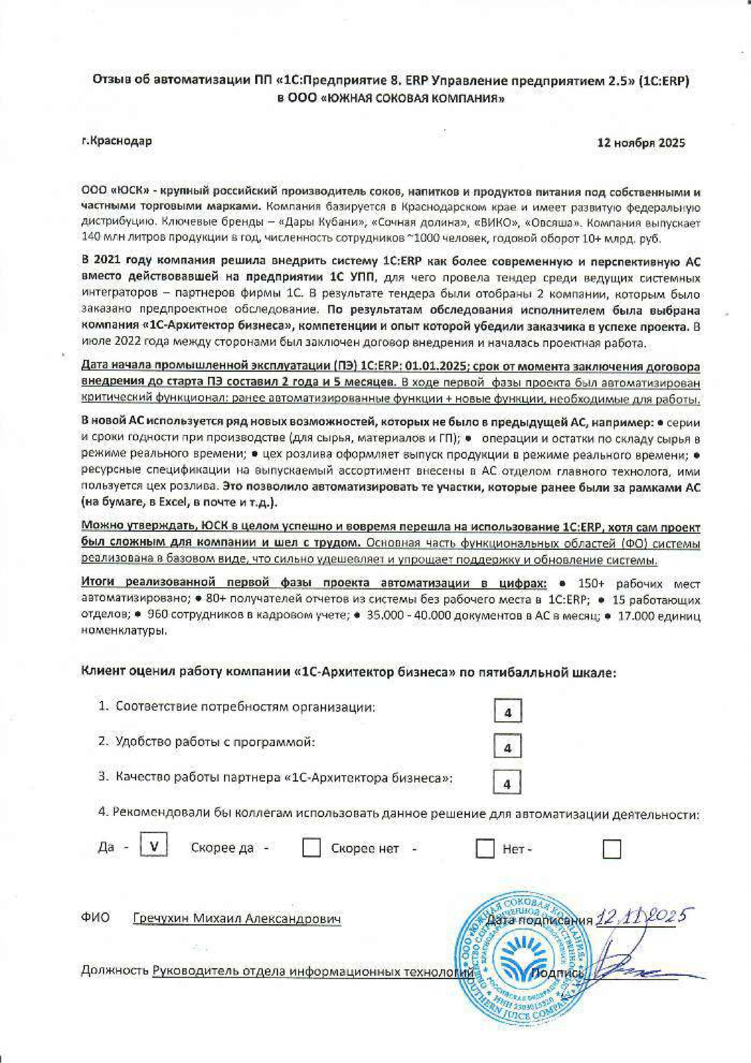 ЮЖНАЯ СОКОВАЯ КОМПАНИЯ построила информационную систему на базе «1С:ERP Управление предприятием». В результате существенно повысились качество и оперативность данных для управления бизнесом, информация теперь вносится в местах возникновения (соответствующих подразделениях — владельцах бизнес-процессов, а не централизованно юухгалтерией. Серии и сроки годности используются как для сырья и материалов, так и для готовой продукции, что позволяет вести потребление сырья и отгрузки готовой продукции по ФИФО, реализовать сквозной учет движения ТМЦ и снижать потери от устаревания ТМЦ. В режиме реального времени отражаются операции и остатки по складу сырья, выпуск продукции в цехе розлива, операции и остатки в распределительном центре (склад готовой продукции). Ранее подготовка и централизованная обработка документов с производства занимали в среднем 2-3 рабочих дня.