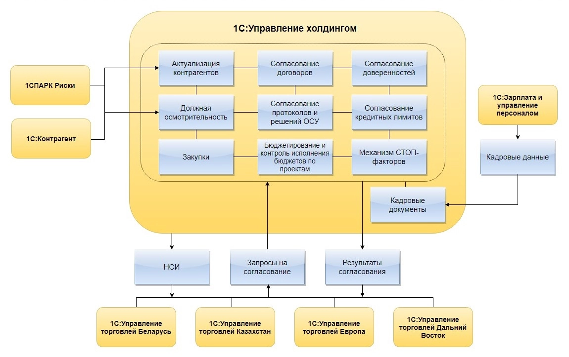 В рамках проекта разработан механизм синхронизации на базе универсального обмена данными в формате XML. Из системы «1С:Управление торговлей» производятся запросы на согласование объектов со всеми необходимыми файлами. Согласование, создание элементов справочников и заявок на их создание происходит в «1С:Управление холдингом». В базе источнике всегда есть возможность посмотреть актуальный ход согласования, благодаря доработанным механизмам на базе HTTP-сервисов. Из системы «1С:Зарплата и управление персоналом» приходит актуальная кадровая информация и карточки пользователей.