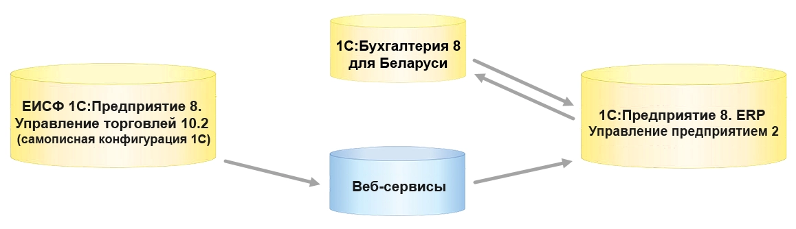 - произведена интеграция с ЕИСФ 1С:УТ 10.2 (самописная конфигурация «1С») через веб-сервис для автоматического заполнения ресурсных спецификаций в решении «1С:ERP Управление предприятием 2 для Беларуси» с учетом существующей схемы работы компании в производственном контуре;