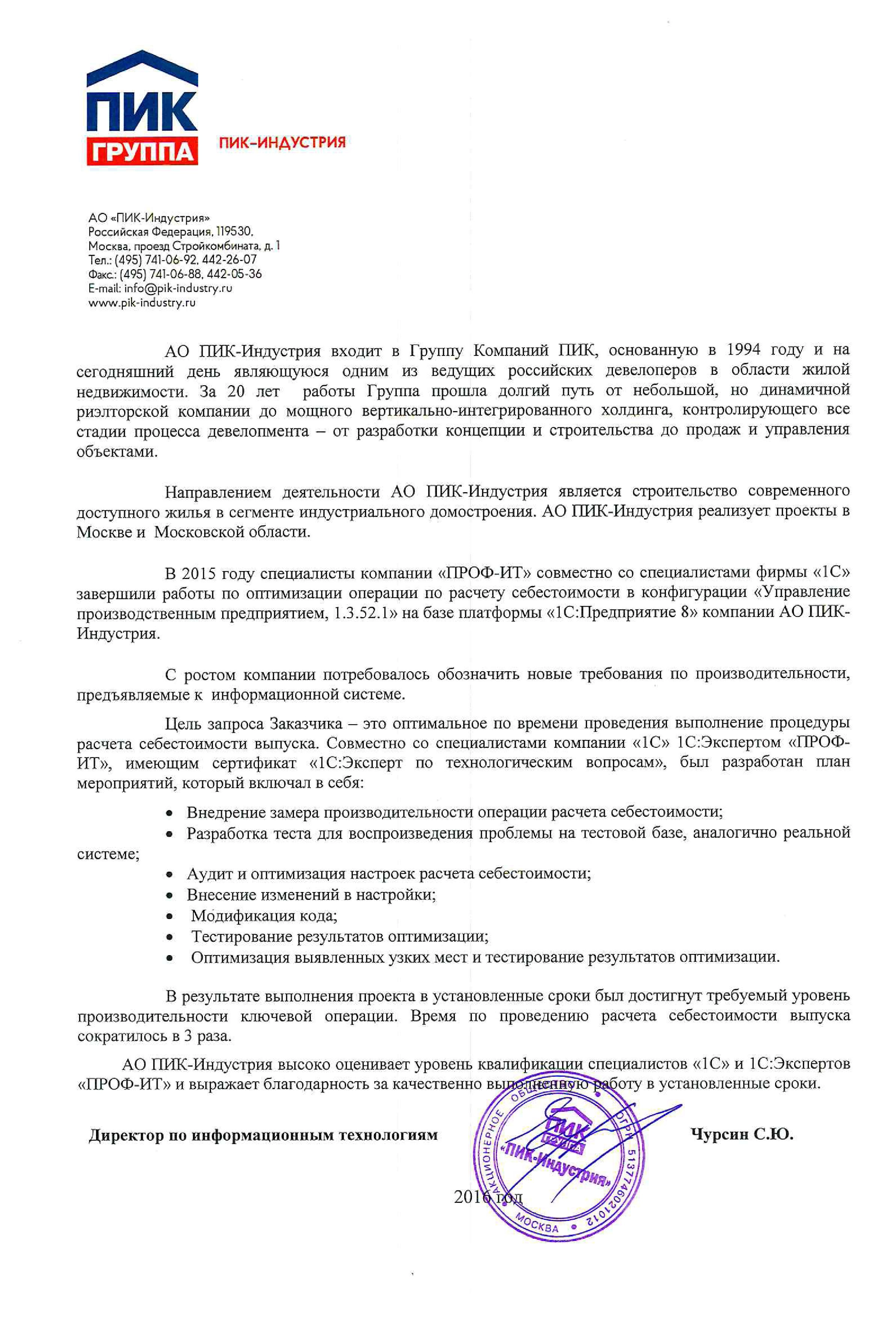 АО ПИК-Индустрия высоко оценивает уровень квалификации специалистов «1С» и 1С:Экспертов «ПРОФ-ИТ» и выражает благодарность за качественно выполненную работу в установленные сроки.