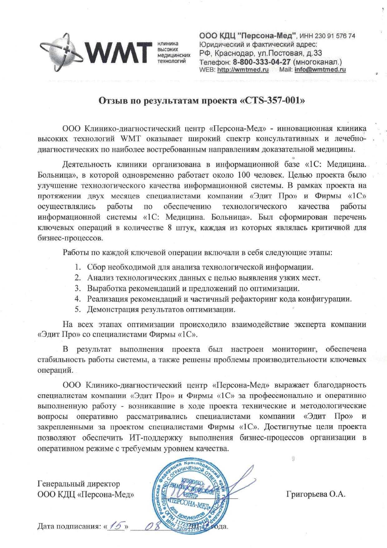 Клинико-диагностический центр «Персона-Мед» выражает благодарность специалистам компании «Эдит Про» и фирмы «1С» за профессионально и оперативно выполненную работу. Возникавшие в ходе проекта технические и методологические вопросы оперативно рассматривались специалистами компании «Эдит Про» и закрепленными за проектом специалистами Фирмы «1С».
