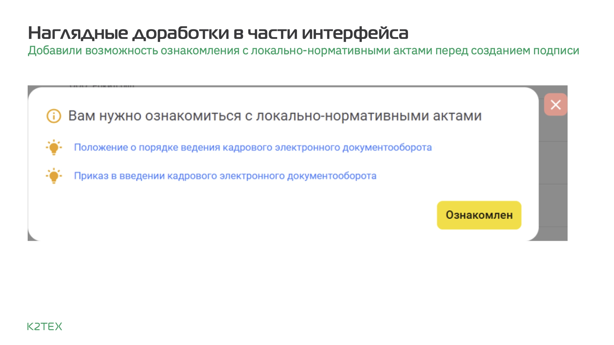 - Предварительного ознакомления сотрудника с локальными нормативными актами непосредственно перед подключением к КЭДО.