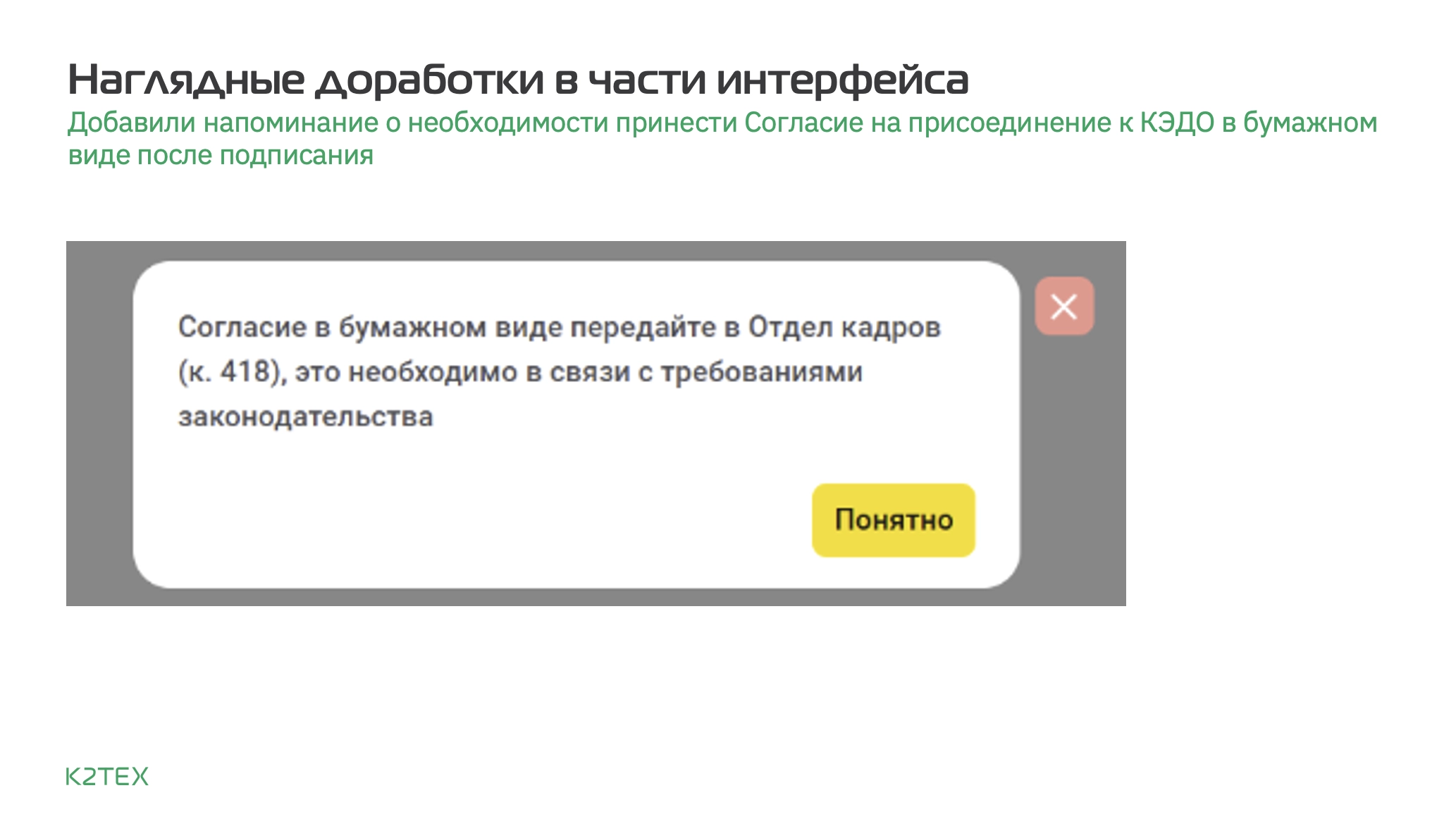 Присоединение сотрудника к системе КЭДО требует получения его официального согласия на бумаге, что является обязательным шагом по законодательству. Типовой функционал системы не предусматривал удобного инструмента для этого. Команда К2Тех разработала и внедрила в систему пошаговый чек-лист, который проводит сотрудника через весь процесс получения согласия при приеме на работу или при первичном подключении к КЭДО, делая процедуру понятной и прозрачной.