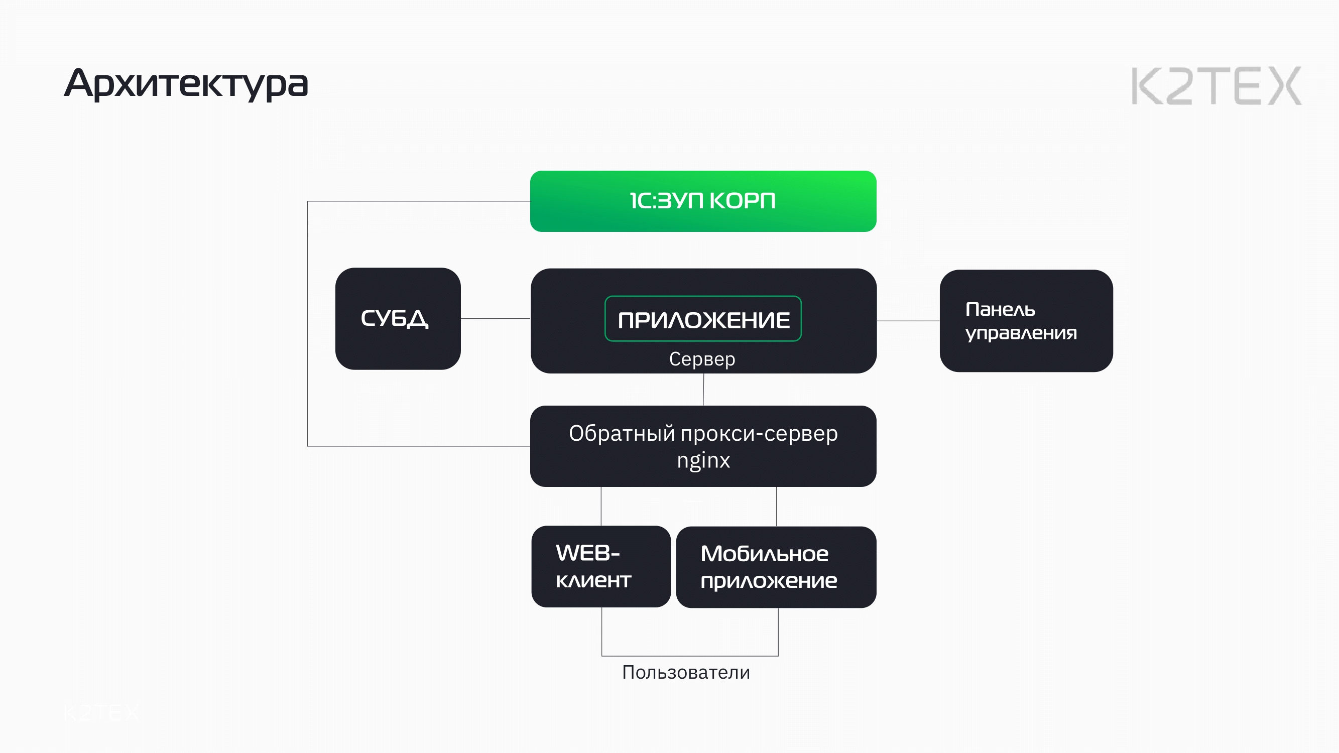 Центральным компонентом системы является сервер. Он отвечает за работу приложения «1С:Кабинет сотрудника», которое реализует всю прикладную функциональность. Приложение использует внешнюю СУБД для хранения информации. Оно работает в связке с 1С:ЗУП КОРП, получает данные о сотрудниках, организационной структуре, документах и другие данные. Сотрудники компании, как пользователи сервиса, подключаются из внешней сети через интернет. Безопасность соединения обеспечивается обратным proxy-сервером nginx, который транслирует запросы